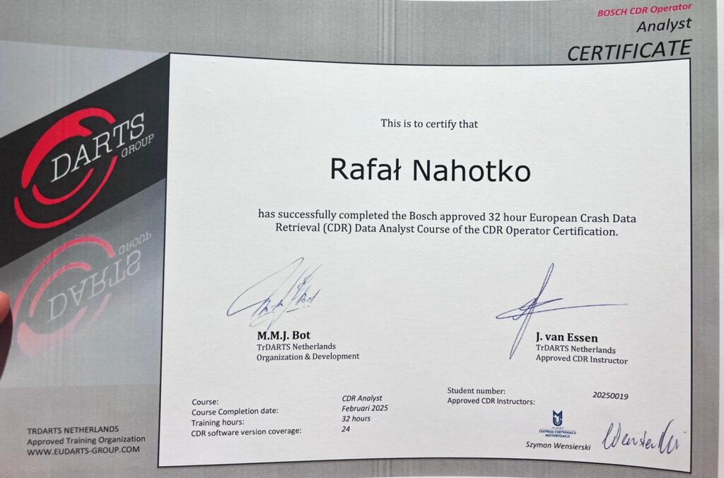 Odczyt danych wypadkowych z EDR wymaga specjalistycznego sprzętu, oprogramowania i wiedzy, aby właściwie zinterpretować dane. Oferujemy usługę odczytu danych wypadkowych EDR na miejscu wypadku lub na parkingach. Przeprowadzamy takie odczyty na zlecenie organów ścigania oraz osób prywatnych, wykonując analizę danych zarówno z pojazdów uszkodzonych częściowo, jak i całkowicie. Odczyt danych odbywa się jednokierunkowo tzn. pobrane są dane bez wprowadzania jakichkolwiek modyfikacji w sterowniki pojazdu.